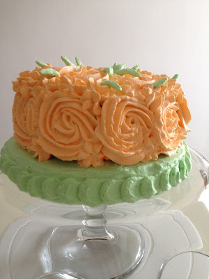 E’ una torta a tre strati, ma posta su due piani: una base più larga di 20cm e due strati più piccoli di 15cm. La torta è al cacao e caffè, aromatizzata all’arancia. Difatti il colore predominante è questo arancione pallido, contornato da un verde altrettanto tenue.